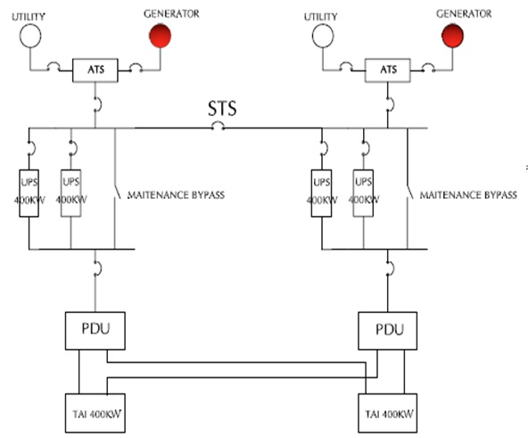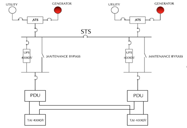 – 2N, 2(N+1), 2N+2, (N+1)+(N+1) đều là các cách gọi khác nhau của hệ thống nguồn này. Hệ thống nguồn kép gồm 2 hệ thống nguồn UPS riêng, mỗi hệ thống UPS được cung câp từ nguồn riêng biệt. hai hệ thống nguồn này cung cấp 2 đường nguồn riêng biệt cho tải.