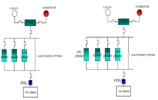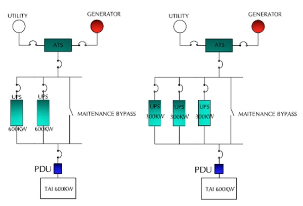 Cấu hình dự phòng song song cho phép có sự cố trên UPS đơn lẻ mà hệ thống nguồn vẫn đủ khả năng cung cấp điện liên tục cho tải.