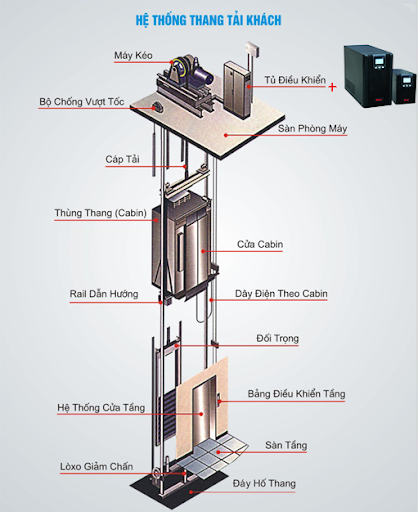 Bộ lưu điện UPS có chức năng lưu điện , cung cấp điện cho cho tủ vi xử lý của thang máy 24/24. Vì tủ vi xử lý trong hệ thống thang máy dùng để điều khiển mọi quá trình hoạt động, nếu sự cố cúp điện đột ngột xảy ra trong khi thang máy đang di chuyển, tất cả các mọi hoạt động của thang máy đều bi ngưng ngay lập tức nghĩa là người đang đi thang máy sẽ bị kẹt trong đó cho đến khi có điện trở lại. Điều này rất bất tiện và nguy hiểm