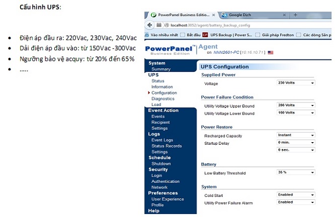 Cài đặt các thông số UPS  như điện áp ngõ vào, ngõ ra, điện áp acquy…..
