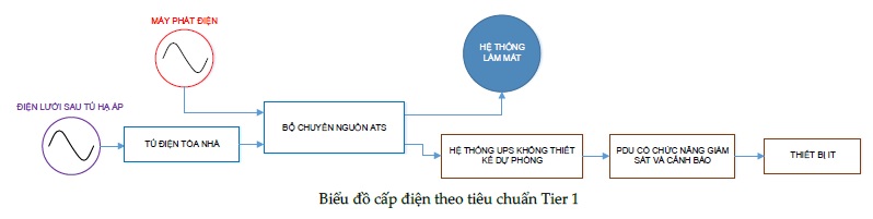 Khi thiết kế TTDL, vấn đề chi phí rất quan trọng và thường được cân nhắc vớicác rủi ro để đưa ra giải pháp phù hợp.Thiết kế hệ thống điện theo cấp độ Tier 1 là giải pháp có chi phí thấp nhất nhưng cũng có rủi ro cao nhất, mỗi thành phần trong hệ thống điện đều là một “đơn điểm gây lỗi” (single point of failure -SPOF). Dưới đây là mô tả về một hệ thống điện đặc trưng theo tiêu chuẩn Tier 1 cho TTDL.